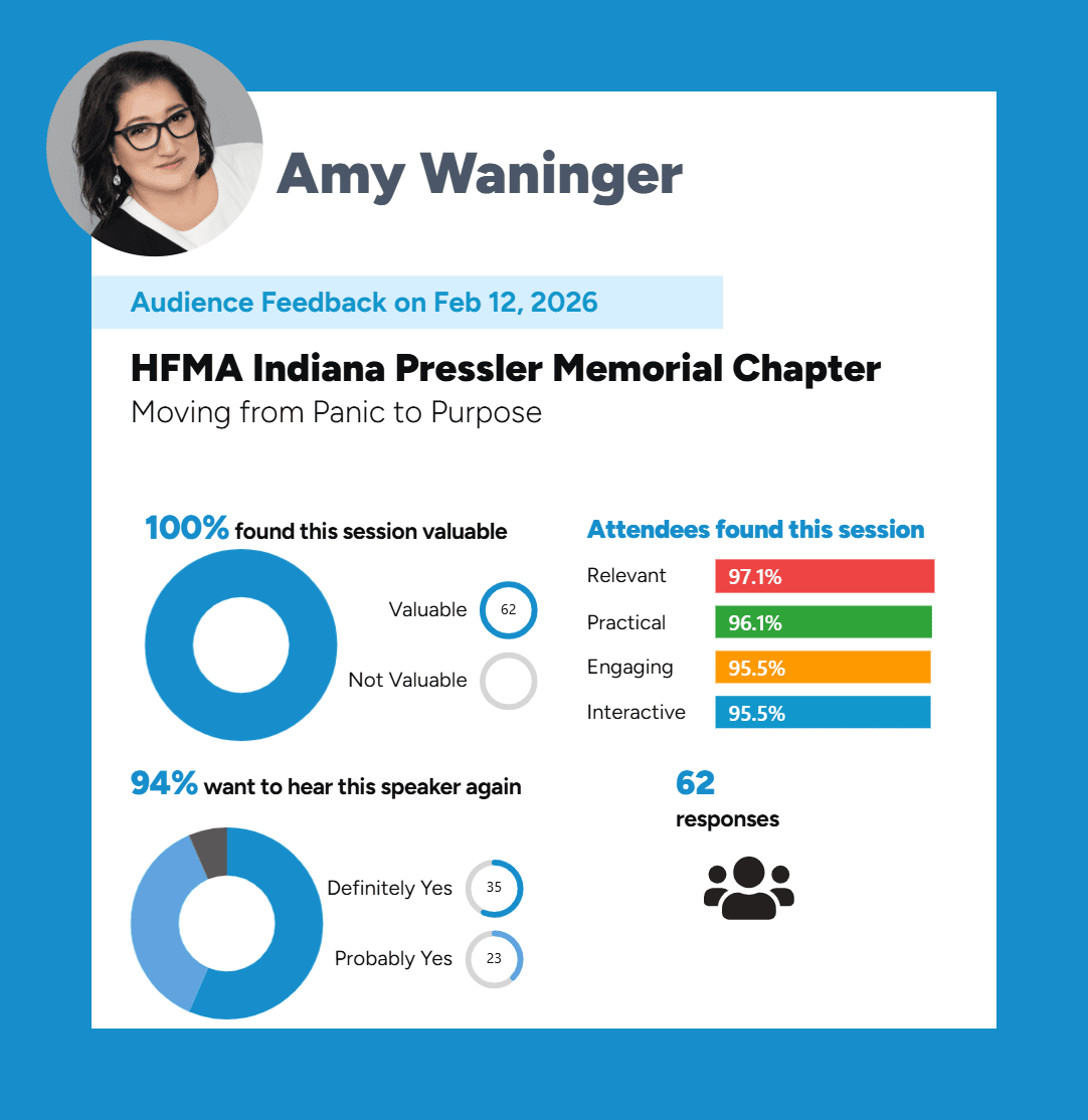 Rather than deliver a generic change management lecture, she tailored Moving from Panic to Purpose to reflect the healthcare finance context. The session explored models of personal and organizational change while helping participants identify their own responses to uncertainty — including fear, resistance, and overextension.