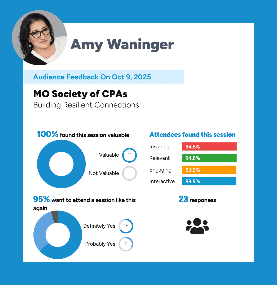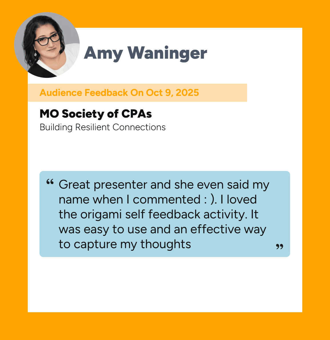 MOCPA rated the collaboration highly, noting Amy’s organization, preparedness, and ease of partnership. They highlighted the value of interactive design—especially in a virtual environment—and emphasized that participants left with tools they could put into action immediately.